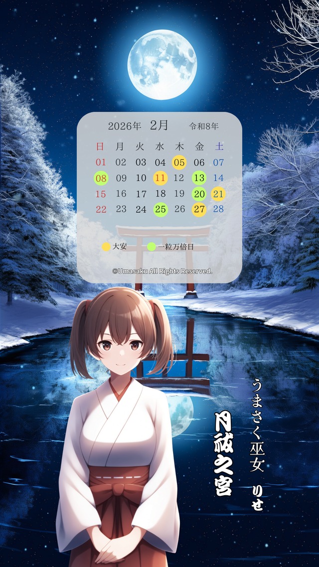 うまさく巫女―― あなたの祈りにそっと寄り添う、静かな存在。 日々の願いや選択にそっと背中を押してくれる、 そんな巫女たちの“祈りの風景”をスマホ壁紙に仕立てました。 本商品は「カレンダー付きスマホ壁紙2枚」と 「うまさくセレクト」1ヶ月(31日+猶予5日間)利用コードのセットです。 ✅ 2月:月祓之宮(つきはらいのみや) 満月と雪の社が幻想的な夜の一枚。 静かな祈りが、迷いを払ってくれるような“浄化と整え”のデザイン。 【ご利益:清め・浄化・直感の導き】 ✅ 3月:瑞花之道(ずいかのみち) 春の訪れとともに咲き始める草花に囲まれた参道。 穏やかな光が未来への歩みを優しく照らしてくれます。 【ご利益:芽吹き・再出発・希望の兆し】 あなたの選んだ数字とともに、 この壁紙が“運の流れ”を少しでも整えてくれる存在になりますように。 ◎こんな方におすすめ ✅スマホを見るたび、癒しと安心感を得たい ✅数字を選ぶ前に、少しだけ運気を整えたい 【重要】ダウンロードは「うまさく公式リンク」から! ✅ BASEのダウンロードリンクはスマホ非推奨です。 ✅ 動作が不安定なため、必ず「うまさく公式ダウンロード」をご利用ください! 【ご利用の流れ】 1️⃣ ご購入後、5分以内に「利用コードの案内メール」が届きます。 2️⃣ うまさくセレクトの画面上部にある 「壁紙表示・ダウンロード」ボタン をタップ 3️⃣ メールに記載の「利用コード」を入力し、壁紙を表示 4️⃣ スマホに保存して壁紙に設定してお楽しみください。 ※現在、安全性のため メール内にURLは記載していません。 ※ダウンロードは うまさくセレクト画面の上部 から行えます。 【保存方法】 iPhone:画像を長押し → 写真に保存 Android:画像を長押し → 画像をダウンロード ※スマホでダウンロードがうまくいかない場合は、PCでダウンロードしてください。 【「うまさくセレクト」利用コードについて】 ▶ 本商品は「壁紙」と「うまさくセレクト利用コード」のセット商品です。 ✅ 利用コードは本商品の一部として提供されており、単体販売は行っておりません。 ✅ 1枚ご購入につき、31日分(+5日分の猶予付き)の利用コードが付属します。 (合計で36日分の有効期限になります。) ✅ 有効期限が過ぎる前に、新しい壁紙を購入することで、スムーズに継続利用が可能です。 ✅ 本製品はデジタルコンテンツ(ダウンロード販売のみ)です。 ✅ 画像はスマホの壁紙として最適化されています。 【決済方法】 ✅ 壁紙(デジタルコンテンツ)は、クレジットカード、PayID(あと払い)のみとなります。 ✅コンビニ払いをご希望の方はPayIDをご利用ください。 【海外ユーザーの方へ】 ✅ 壁紙(デジタルコンテンツ)は、日本国内・海外どちらでも購入&ダウンロード可能です。 ✅ ただし、一部の決済方法(コンビニ決済・PayID)は日本国内限定となります。 ✅ 海外からの購入は、クレジットカード決済のみ対応しております。 【重要】メールアドレスの入力ミスに注意! ✅ 間違えると利用コードが届きません! ✅ ご購入前にメールアドレスをしっかり確認してください。 【ご安心ください】 ✅ うまさくセレクトは買い切り制です。 ✅ 購入後に追加でお金がかかることは一切ありません。 ✅ 有効期限を過ぎても、自動的に料金が発生することはありません。再購入をご希望の場合のみ、お手続きいただく形となります。 【キャラクターに関する表記】 本商品に登場する「巫女りせ」は、当ショップが運営する「うまさく巫女」シリーズ(商標登録出願中)に登場するオリジナルキャラクターです。キャラクターデザイン・名称・世界観は、すべて当ショップで制作・管理しております。 ※デジタル商品のため、ご購入後のキャンセル・返金はできません(詳細は「特定商取引法に基づく表記」をご確認ください)。
