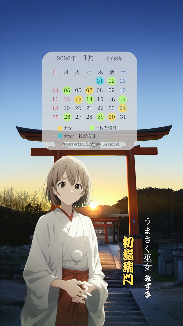 巫女かえで ― 静かな強さで寄り添う、長女の祈り。 新しい年の始まり。 参道に立ち、そっと願いに寄り添うように祈る巫女かえでが、 一年の最初の一歩を、静かに見守ります。 本セットは、 1月 → 2月 → 3月 → 4月 冬の祈りから、春の兆し、新緑の導きへと移ろう “運気の巡り”を、かえでとともに感じられる スマホ用・祈願デザイン壁紙4枚セットです。 スマホの待受に設定することで、 心が落ち着き、数字選びの迷いも自然と整っていく── そんな**「長女の見守り」**を感じられる構成になっています。 ✅ 1月:初詣瑞門(はつもうでずいもん) 新年の参道に立つ鳥居と、朝の光に包まれるかえで。 一年の願いを静かに整え、心をまっすぐにする“始まりの一枚”。 【ご利益:心願成就/静心/新年の導き】 ✅ 2月:雪灯静詣(ゆきあかりせいもうで) 雪の参道に並ぶ灯籠と、穏やかに祈るかえで。 静寂の中で心を落ち着かせ、冷静な判断力を育む一枚。 【ご利益:浄化/落ち着き/迷いの整理】 ✅ 3月:春霞森詣(はるがすみもりもうで) 早春の森に差し込む柔らかな光と、苔むす参道。 季節の動きとともに、前向きな流れをそっと呼び込む壁紙。 【ご利益:再出発/希望/運気の芽吹き】 ✅ 4月:新緑参道(しんりょくさんどう) 新緑に包まれた参道と、穏やかに佇むかえで。 伸びやかに巡る気配が、新しい挑戦と継続を後押しします。 【ご利益:安定/成長/前進の運気】 “祈りと季節で整える、あなたの一年の運気。” 巫女かえでのやさしい見守りと、 冬から春へと巡る自然の流れを、 スマホの待受に宿す4枚セット。 3ヶ月分の「うまさくセレクト」利用コードとともに、 日々の数字選びを、静かに・確かに後押しします。 【重要】ダウンロードは「うまさく公式リンク」から! ✅ BASEのダウンロードリンクでは1枚ずつしか取得できません。 ✅ スムーズにダウンロードするため、「うまさく公式ダウンロード」をご利用ください! 【ご利用の流れ】 1️⃣ ご購入後、5分以内に「利用コードの案内メール」が届きます。 2️⃣ うまさくセレクトの画面上部にある 「壁紙表示・ダウンロード」ボタン をタップ 3️⃣ メールに記載の「利用コード」を入力し、壁紙を表示 4️⃣ スマホに保存して壁紙に設定してお楽しみください。 ※現在、安全性のため メール内にURLは記載していません。 ※ダウンロードは うまさくセレクト画面の上部 から行えます。 【保存方法】 iPhone:画像を長押し → 写真に保存 Android:画像を長押し → 画像をダウンロード ※スマホでダウンロードがうまくいかない場合は、PCでダウンロードしてください。 【「うまさくセレクト」利用コードについて】 ▶ 本商品は「カレンダー付き壁紙3枚」と「うまさくセレクト利用コード」のセット商品です。 ✅ 利用コードは本商品の一部として提供されており、単体販売は行っておりません。 ✅ 1商品ご購入につき、93日分(+5日分の猶予付き)の利用コードが付属します。 (合計で98日分の有効期限になります。) ✅ 本製品はデジタルコンテンツ(ダウンロード販売のみ)です。 ✅ 画像はスマホの壁紙として最適化されています。 【決済方法】 ✅ 壁紙(デジタルコンテンツ)は、クレジットカード、PayID(あと払い)のみとなります。 ✅コンビニ払いをご希望の方はPayIDをご利用ください。 【海外ユーザーの方へ】 ✅ 壁紙(デジタルコンテンツ)は、日本国内・海外どちらでも購入&ダウンロード可能です。 ✅ ただし、一部の決済方法(コンビニ決済・PayID)は日本国内限定となります。 ✅ 海外からの購入は、クレジットカード決済のみ対応しております。 【重要】メールアドレスの入力ミスに注意! ✅ 間違えると利用コードが届きません! ✅ ご購入前にメールアドレスをしっかり確認してください。 【ご安心ください】 ✅ うまさくセレクトは買い切り制です。 ✅ 購入後に追加でお金がかかることは一切ありません。 ✅ 有効期限を過ぎても、自動的に料金が発生することはありません。再購入をご希望の場合のみ、お手続きいただく形となります。 【キャラクターに関する表記】 本商品に登場する「巫女かえで」は、当ショップが運営する「うまさく巫女」シリーズ(商標登録済)に登場するオリジナルキャラクターです。キャラクターデザイン・名称・世界観は、すべて当ショップで制作・管理しております。