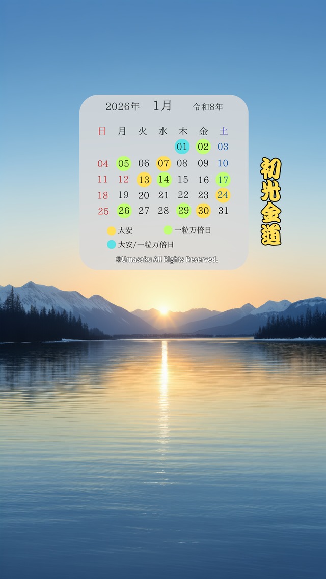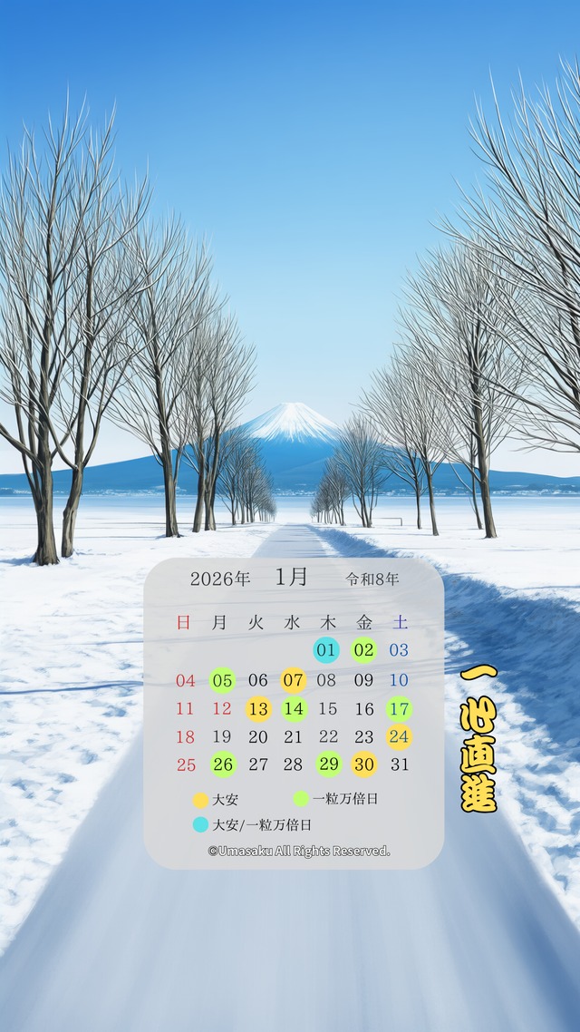 本商品は、 2026年1月・2月・3月・4月のカレンダー付きスマホ壁紙 合計4枚と、 31日分(+5日間の猶予付き)の「うまさくセレクト」利用コードがセットになった 風景特化型のデジタル商品です。 ※本セットには うまさく巫女は登場しません。 自然の風景そのものが持つ「静けさ」「流れ」「奥行き」を大切にしたデザインです。 ✅ 1月:初光金道(しょこうきんどう) 新年の朝、湖面に伸びる一筋の光が、静かに道を示す風景。 一年の始まりに、心と流れをまっすぐ整える一枚です。 ✅ 2月:静流整財(せいりゅうせいざい) 雪に囲まれた静かな流れが、滞りをほどき整えていく情景。 落ち着いた判断と、穏やかな運の巡りを感じさせます。 ✅ 3月:雪灯富光(せっとうふこう) 残雪の中に差し込むやさしい光が、春の兆しを告げる風景。 静けさの中から、少しずつ広がる希望を映した一枚です。 ✅ 4月:潤流定財(じゅんりゅうていざい) 雪解け水が豊かに流れ、生命力が満ちていく渓流の景色。 安定した流れと、確かな積み重ねを感じさせる一枚です。 ✅ 全壁紙カレンダー付き 自然の運気と「うまさくセレクト」の数字が調和し、 日々の判断や願掛けを力強くサポートします。 ✅ 含まれるもの •高画質スマホ壁紙 4枚(1月〜4月) •「うまさくセレクト」利用コード:3ヶ月分(+5日猶予) ✅ “運気は季節とともに巡る” 美しい風景を待ち受けにするだけで、 心の状態・判断力・巡りが自然と整っていきます。 あなたの4ヶ月に寄り添う、優しい運気の流れをどうぞ。 【価格&特典】 ✅ 通常価格 1350円 → 1250円!(4枚まとめ買いで100円お得!) ✅ 3ヶ月分の利用コード付きで、購入の手間が省けます! 【ダウンロードについて】 ✅ BASEのダウンロードリンクでは1枚ずつしか取得できません。 ✅ スムーズにダウンロードするため、「うまさく公式ダウンロード」をご利用ください! 【ご利用の流れ】 1️⃣ ご購入後、5分以内に「利用コードの案内メール」が届きます。 2️⃣ うまさくセレクトの画面上部にある 「壁紙表示・ダウンロード」ボタン をタップ 3️⃣ メールに記載の「利用コード」を入力し、壁紙を表示 4️⃣ スマホに保存して壁紙に設定してお楽しみください。 ※現在、安全性のため メール内にURLは記載していません。 ※ダウンロードは うまさくセレクト画面の上部 から行えます。 【保存方法】 iPhone:画像を長押し → 写真に保存 Android:画像を長押し → 画像をダウンロード ※スマホでダウンロードがうまくいかない場合は、PCでダウンロードしてください。 【「うまさくセレクト」利用コードについて】 ▶ 本商品は「カレンダー付き壁紙3枚」と「うまさくセレクト利用コード」のセット商品です。 ✅ 利用コードは本商品の一部として提供されており、単体販売は行っておりません。 ✅ 1商品ご購入につき、93日分(+5日分の猶予付き)の利用コードが付属します。 (合計で98日分の有効期限になります。) ✅ 本製品はデジタルコンテンツ(ダウンロード販売のみ)です。 ✅ 画像はスマホの壁紙として最適化されています。 【決済方法】 ✅ 壁紙(デジタルコンテンツ)は、クレジットカード、PayID(あと払い)のみとなります。 ✅コンビニ払いをご希望の方はPayIDをご利用ください。 【海外ユーザーの方へ】 ✅ 壁紙(デジタルコンテンツ)は、日本国内・海外どちらでも購入&ダウンロード可能です。 ✅ ただし、一部の決済方法(コンビニ決済・PayID)は日本国内限定となります。 ✅ 海外からの購入は、クレジットカード決済のみ対応しております。 【重要】メールアドレスの入力ミスに注意! ✅ 間違えると利用コードが届きません! ✅ ご購入前にメールアドレスをしっかり確認してください。 【ご安心ください】 ✅ うまさくセレクトは買い切り制です。 ✅ 購入後に追加でお金がかかることは一切ありません。 ✅ 有効期限を過ぎても、自動的に料金が発生することはありません。再購入をご希望の場合のみ、お手続きいただく形となります。 ※デジタル商品のため、ご購入後のキャンセル・返金はできません(詳細は「特定商取引法に基づく表記」をご確認ください)。
