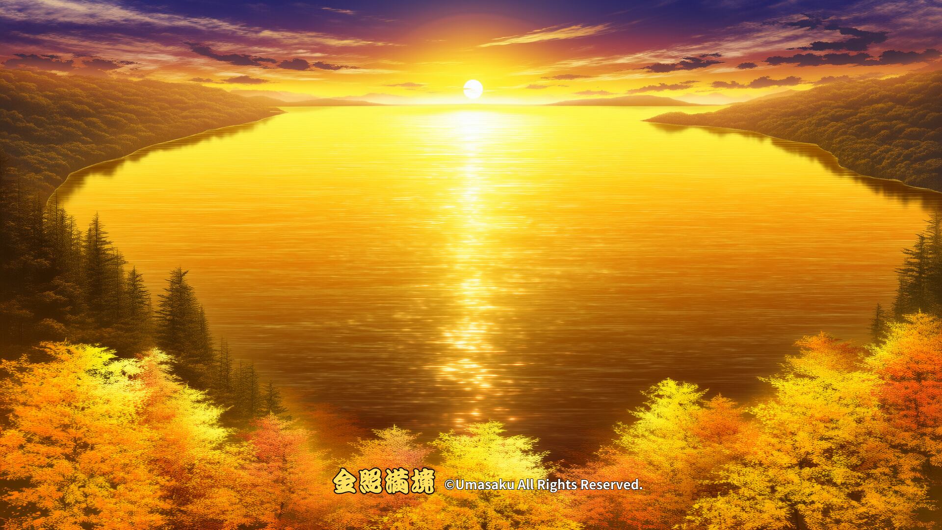 黄金の湖面が夕日を抱きしめるように輝く風景。