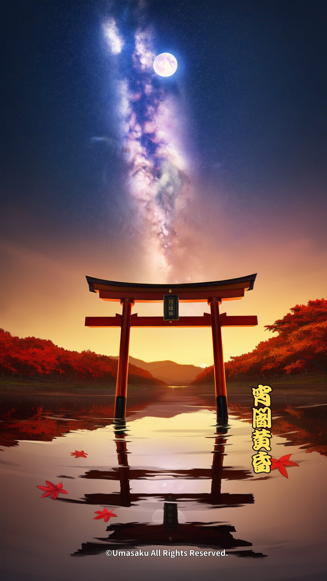 星空と月が昇る水辺に浮かぶ鳥居と紅葉の風景。