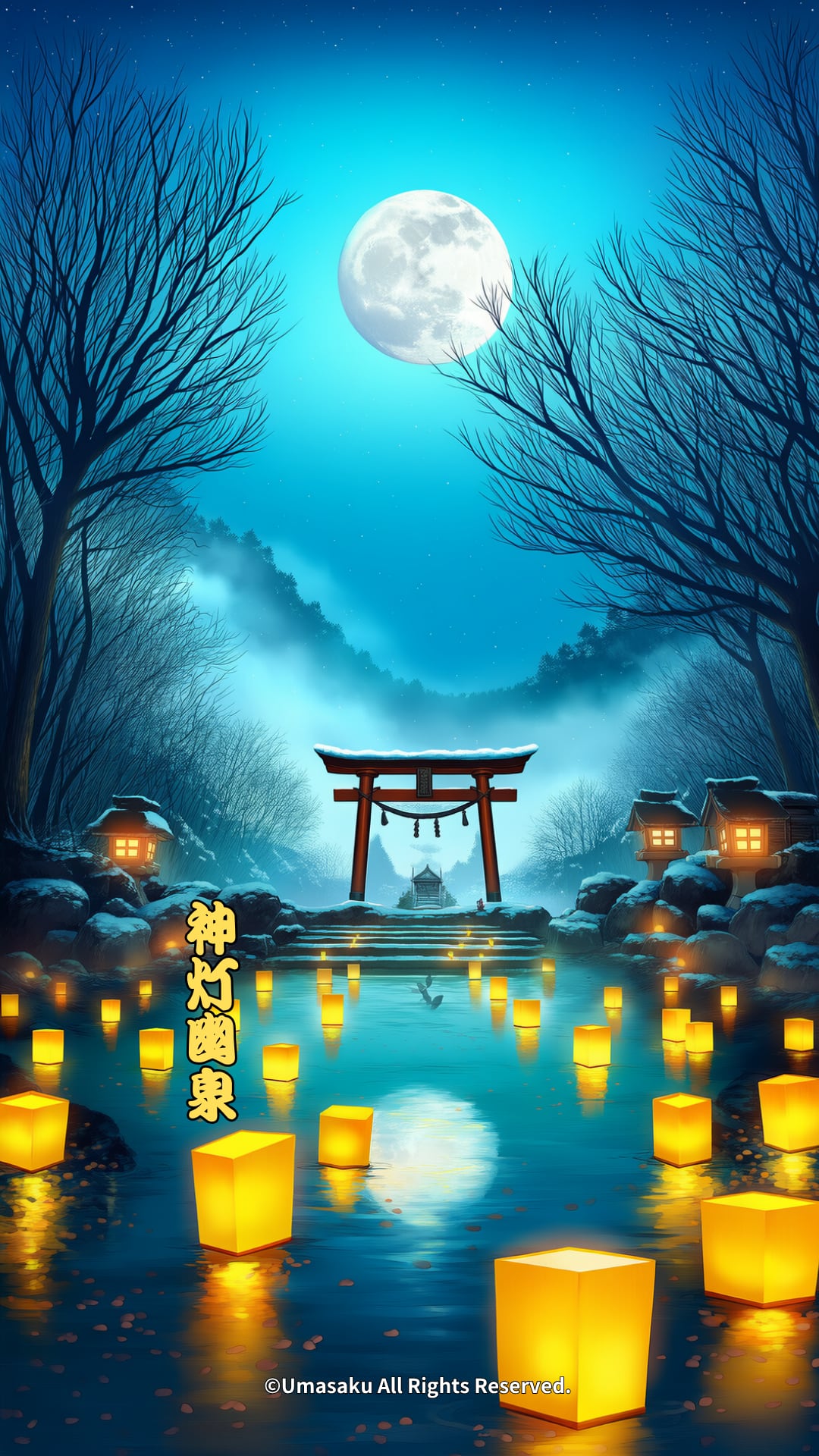 満月と神社、静かに流れる川に灯る祈りの灯籠たち。