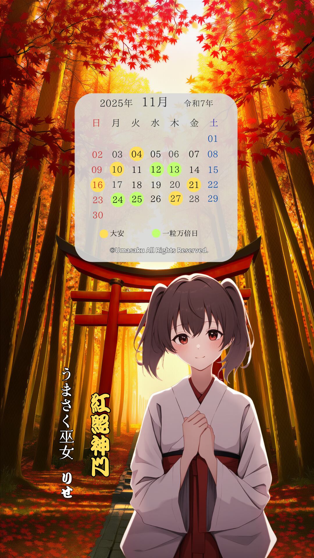 壁紙はカレンダー付き/巫女つきの“ご利益デザイン”