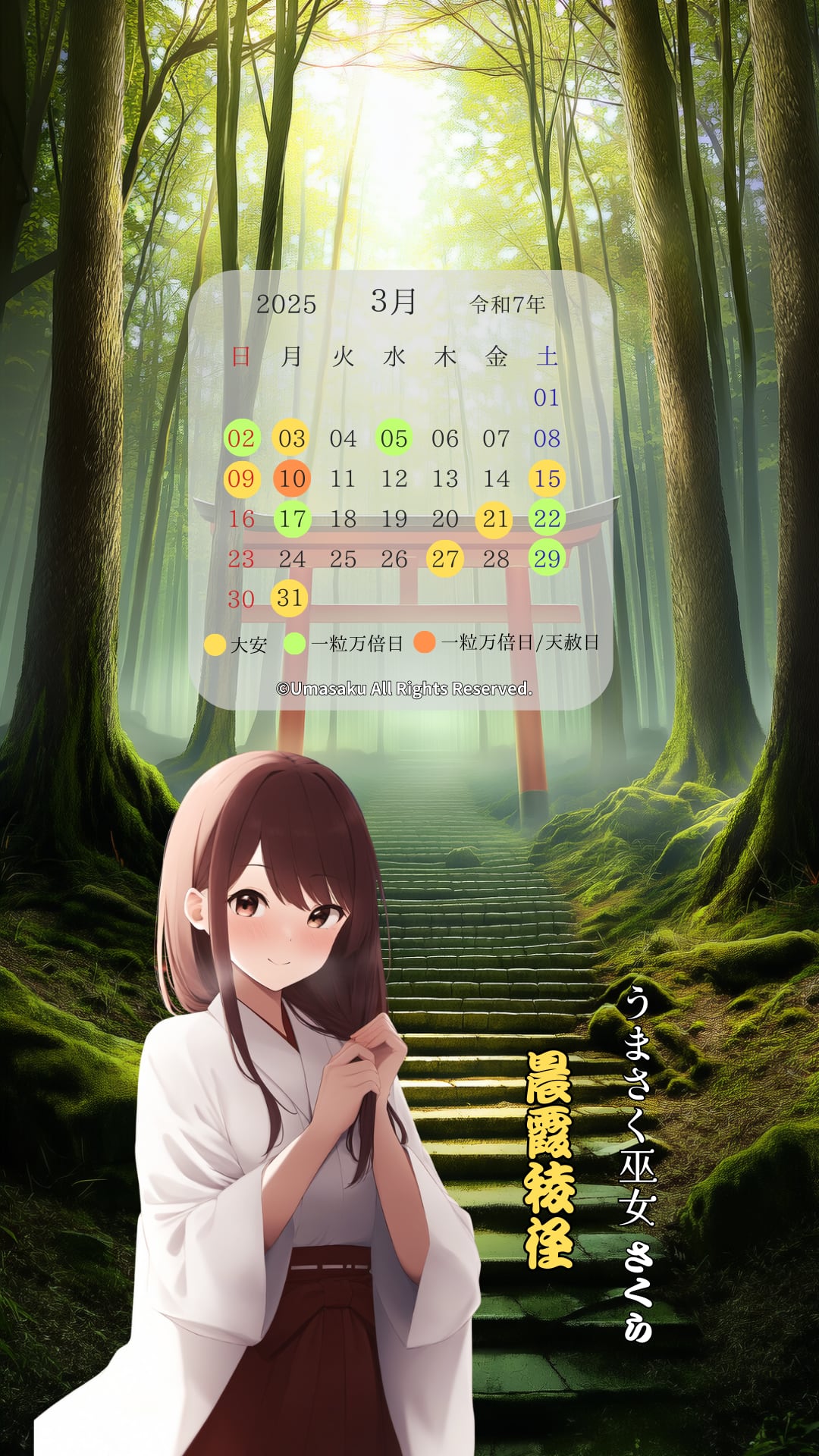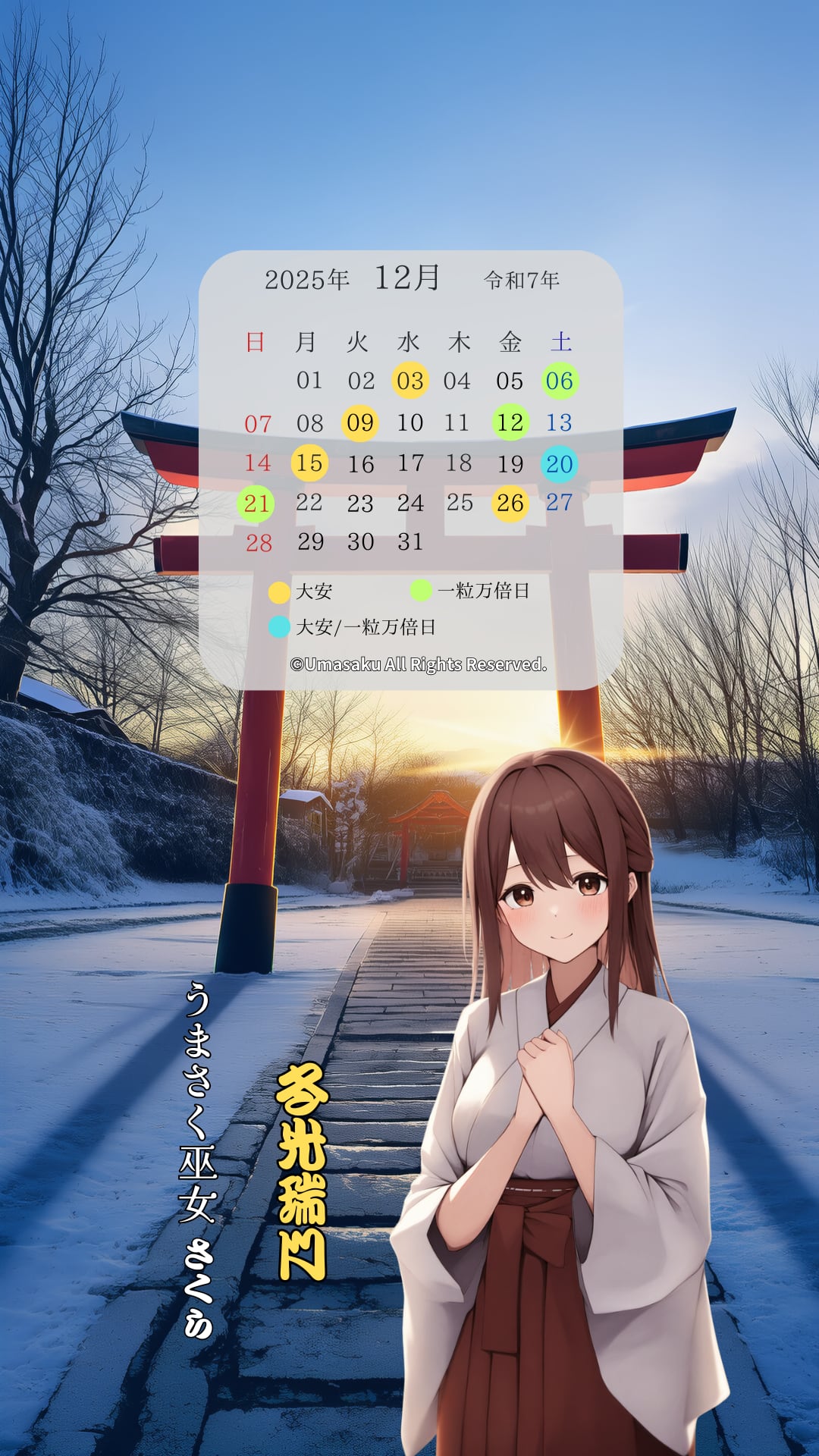 本商品に登場する「巫女さくら」は、当ショップが運営する「うまさく巫女」シリーズ(商標登録済)に登場するオリジナルキャラクターです。キャラクターデザイン・名称・世界観は、すべて当ショップで制作・管理しております。
