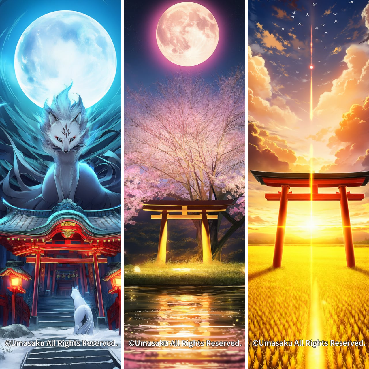 白狐が願いを運び、桜と月の縁、稲穂が豊かさをもたらす──