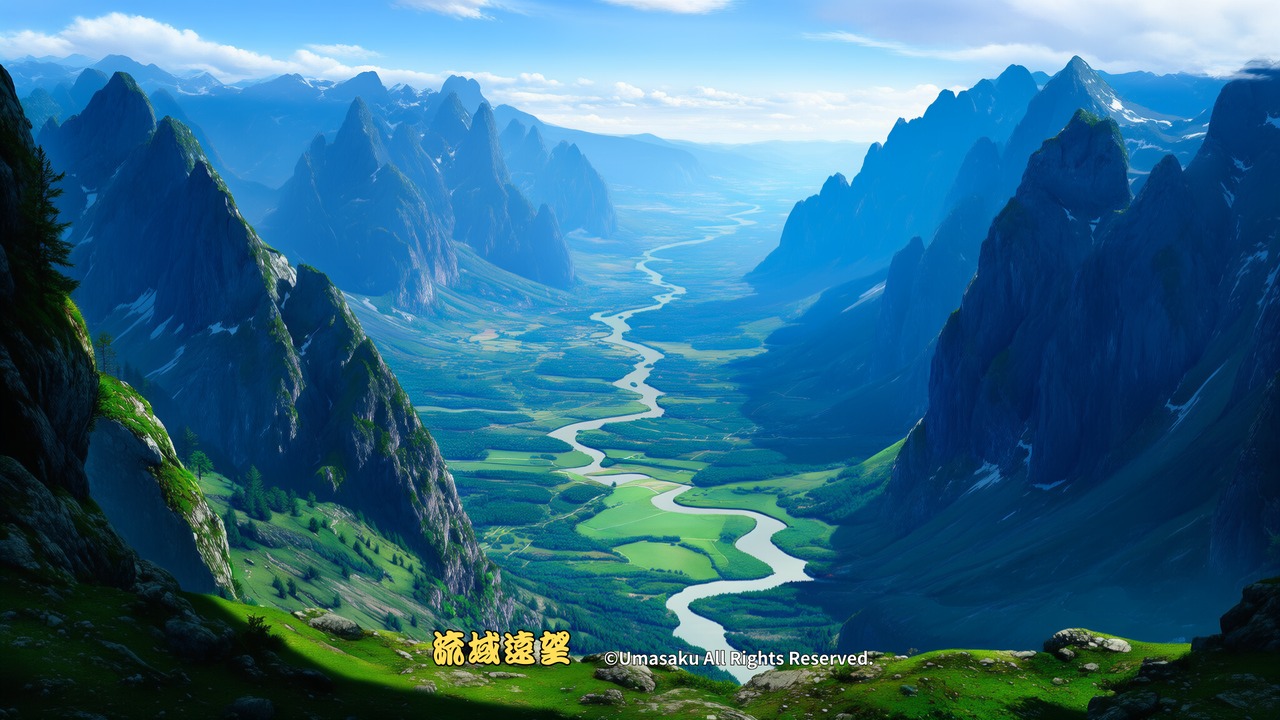 大地を縫う川の流れを、高所から見渡す雄大な風景。
