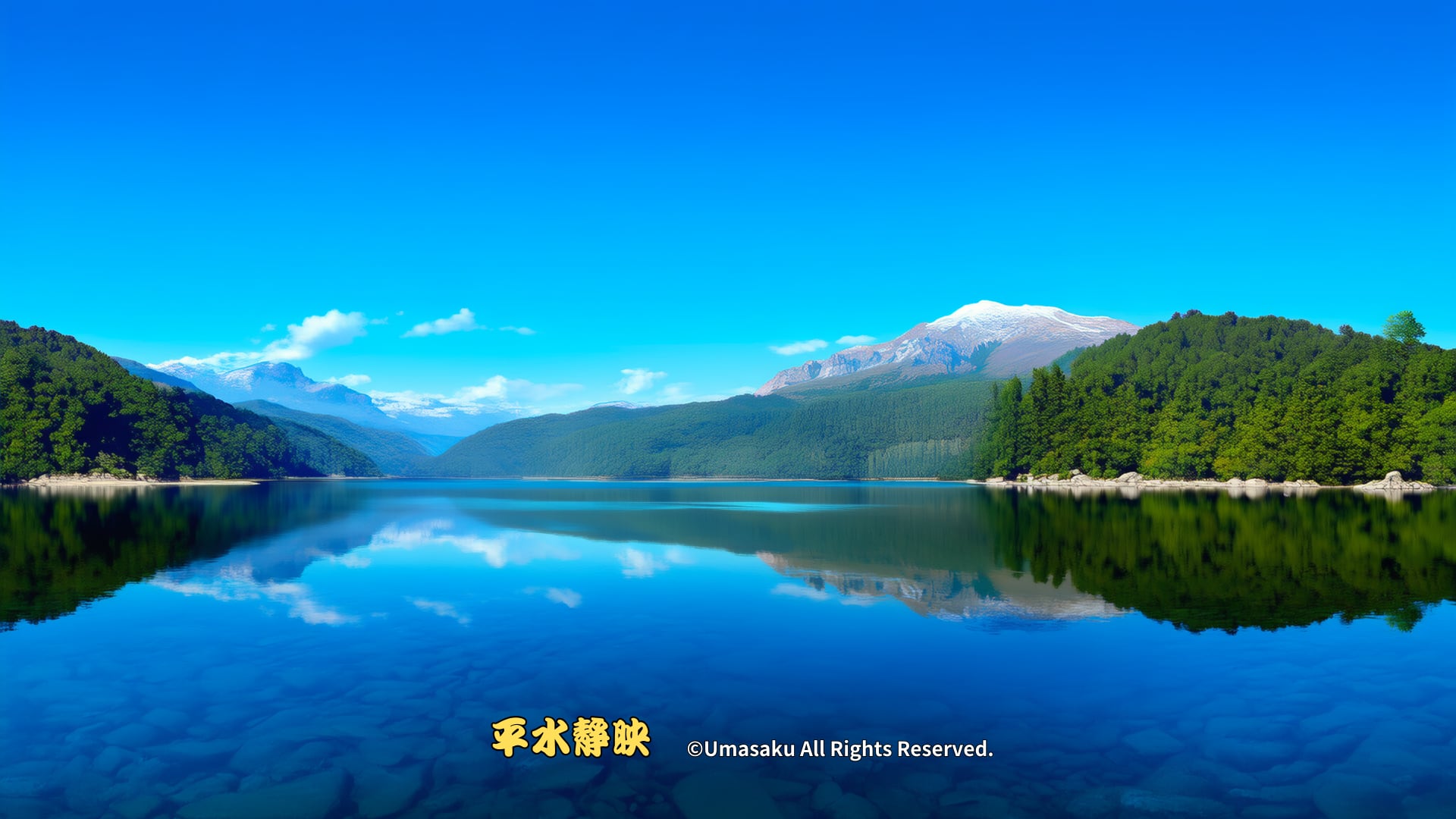 凪いだ水面に、空と山が静かに映り込む一枚。