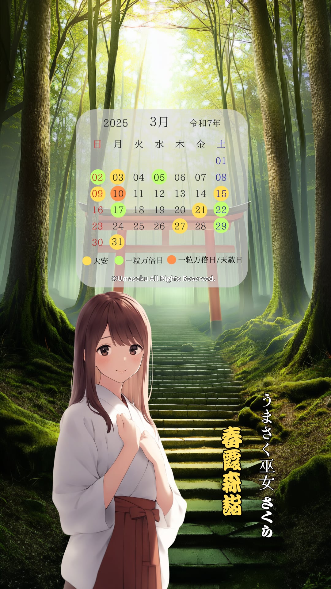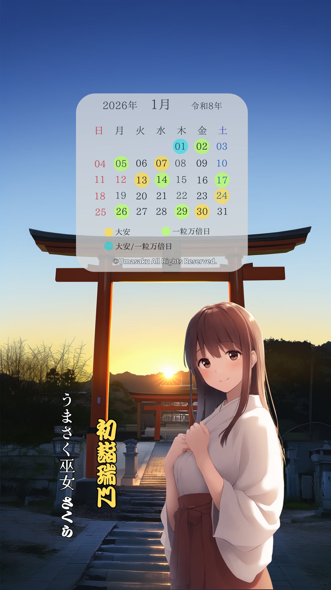 本商品に登場する「巫女さくら」は、当ショップが運営する「うまさく巫女」シリーズ(商標登録済)に登場するオリジナルキャラクターです。キャラクターデザイン・名称・世界観は、すべて当ショップで制作・管理しております。