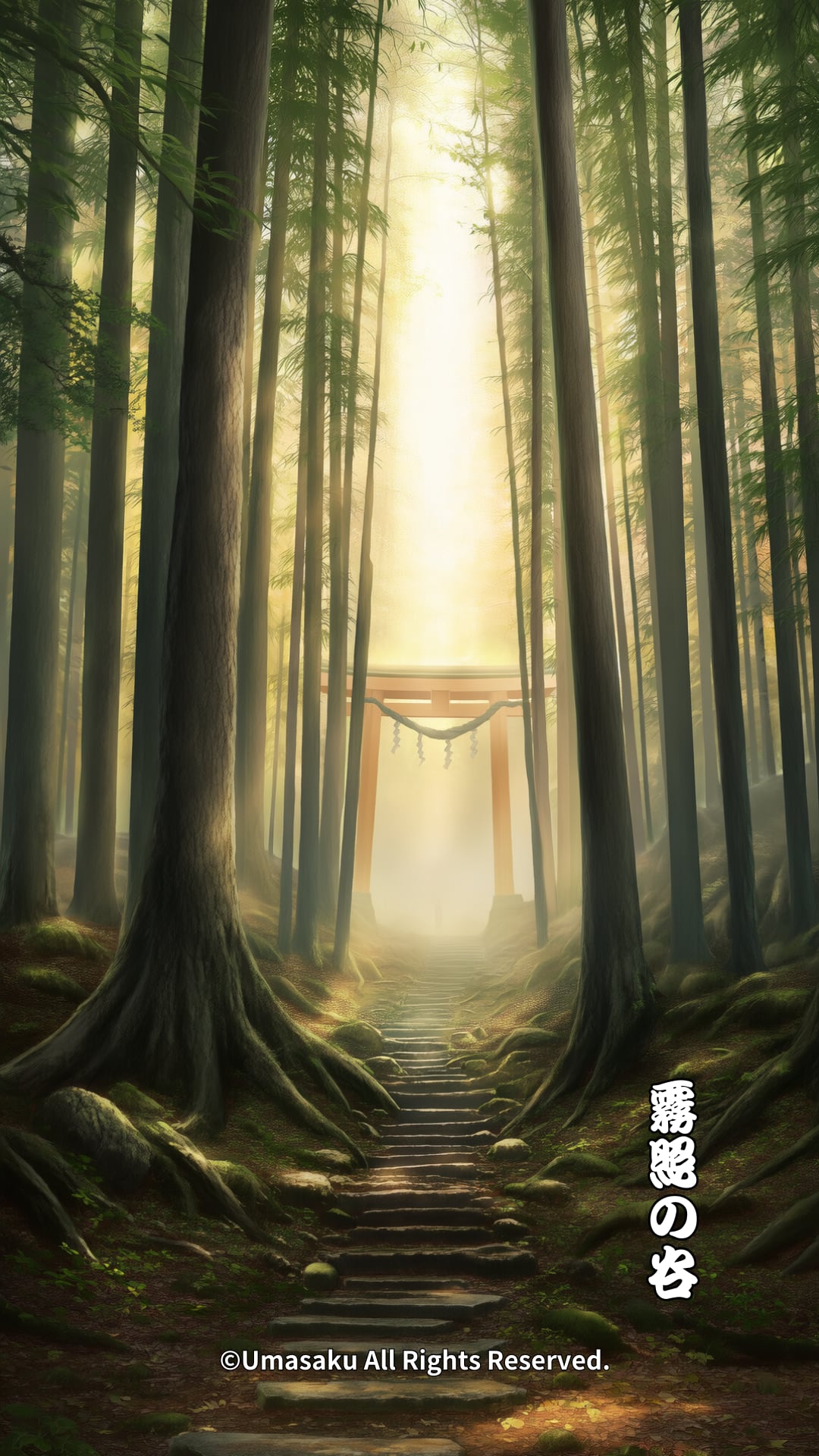 深い森の中、射し込む陽光が霧を照らし、鳥居を包む幻想的な風景。