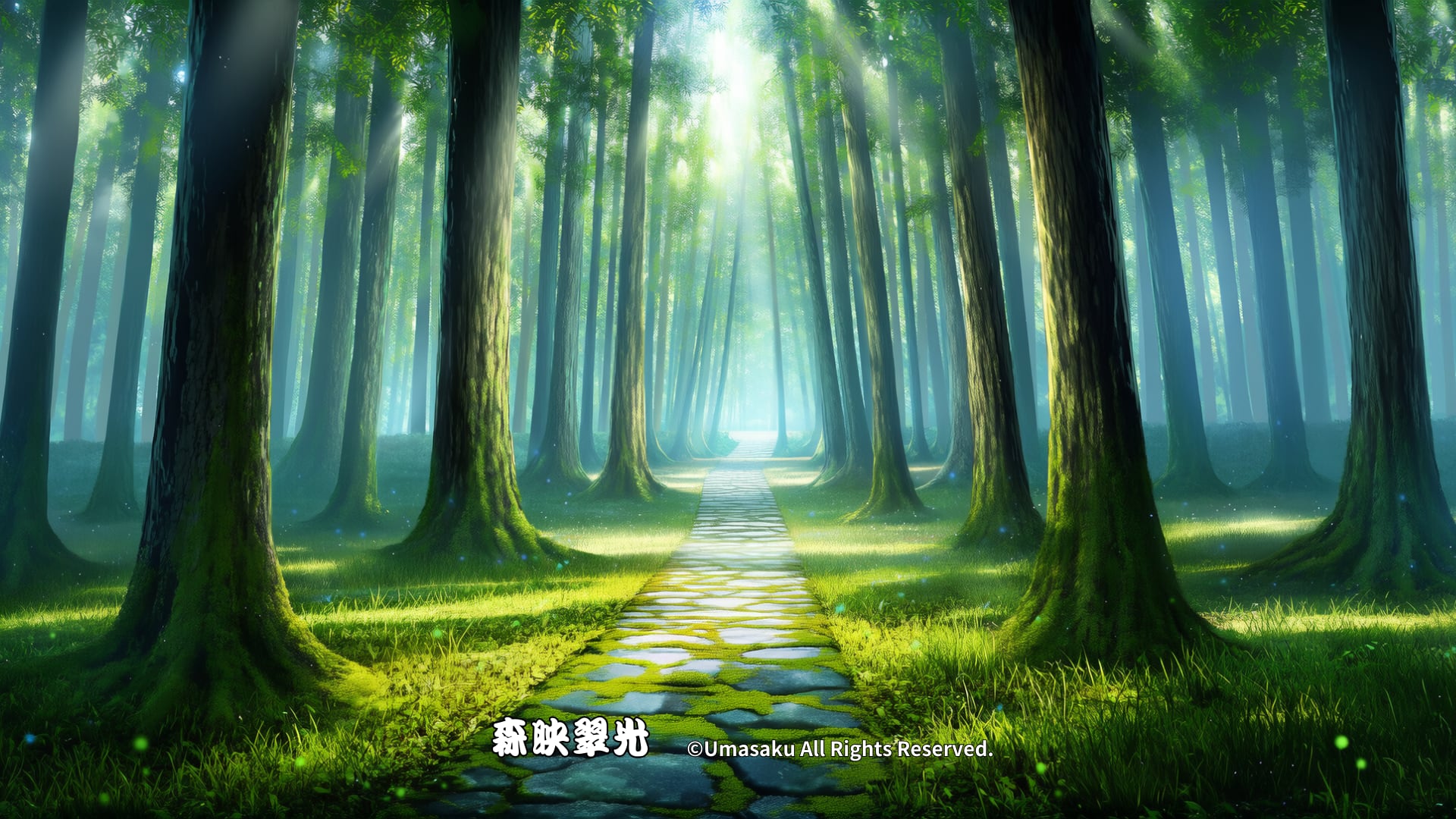 光差し込む森の道に、鮮やかな緑が広がる一枚。