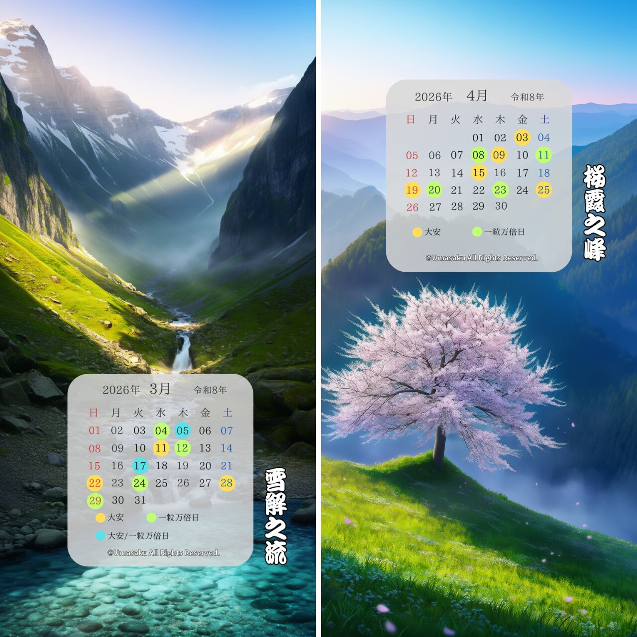 2026年 3月・4月のカレンダー付きスマホ壁紙2枚 と、