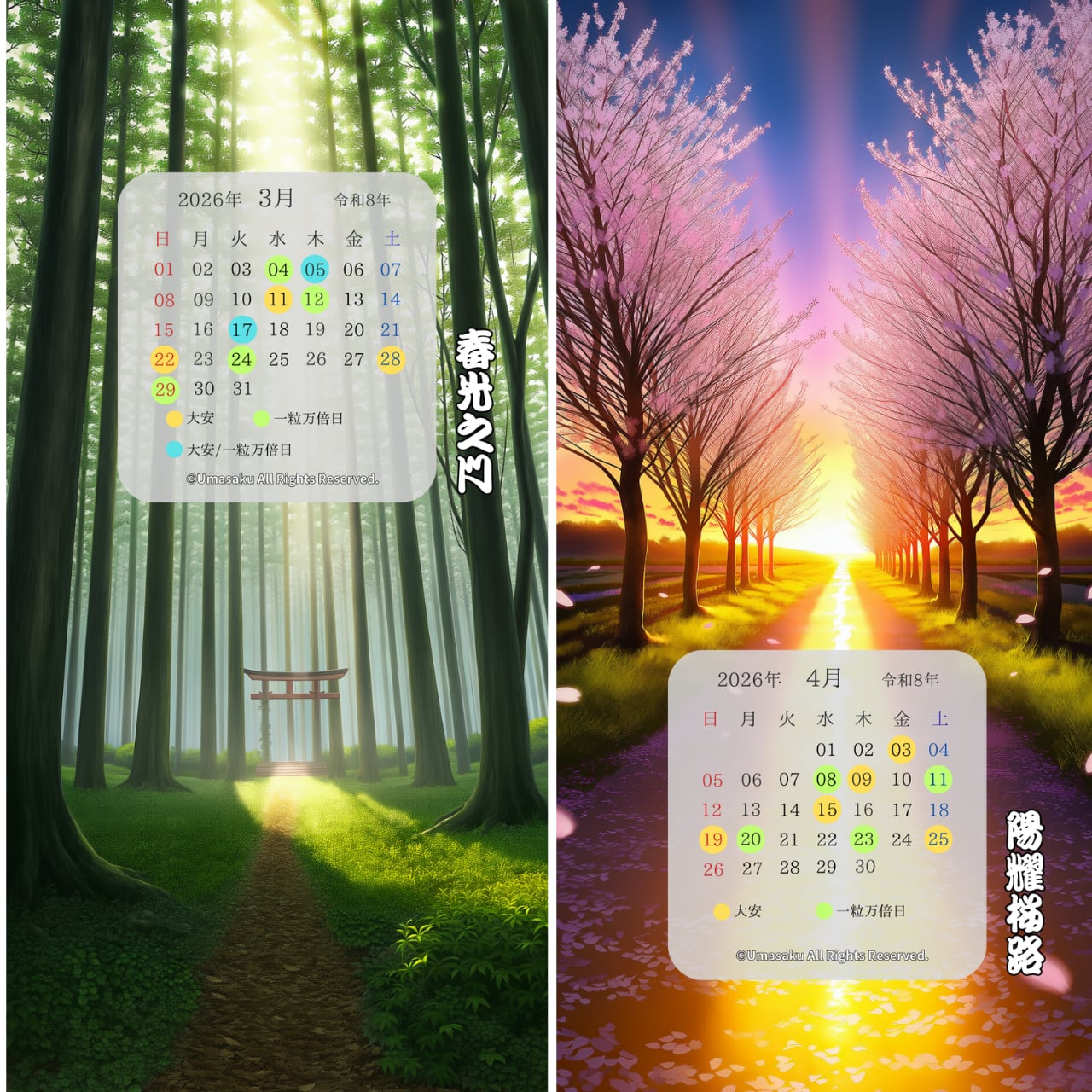 2026年3月・4月のカレンダー付きスマホ壁紙2枚と、