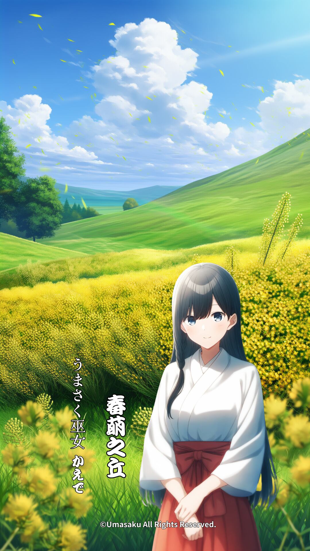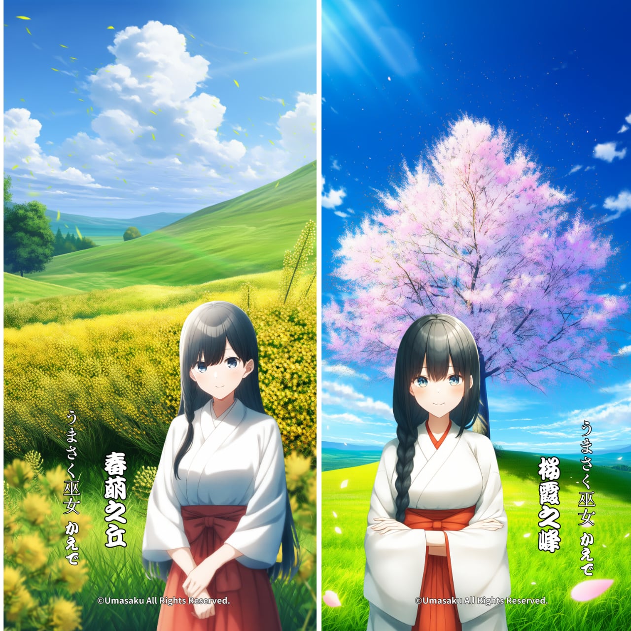 本商品に登場する「巫女かえで」は、当ショップが運営する「うまさく巫女」シリーズ(商標登録出願中)に登場するオリジナルキャラクターです。キャラクターデザイン・名称・世界観は、すべて当ショップで制作・管理しております。