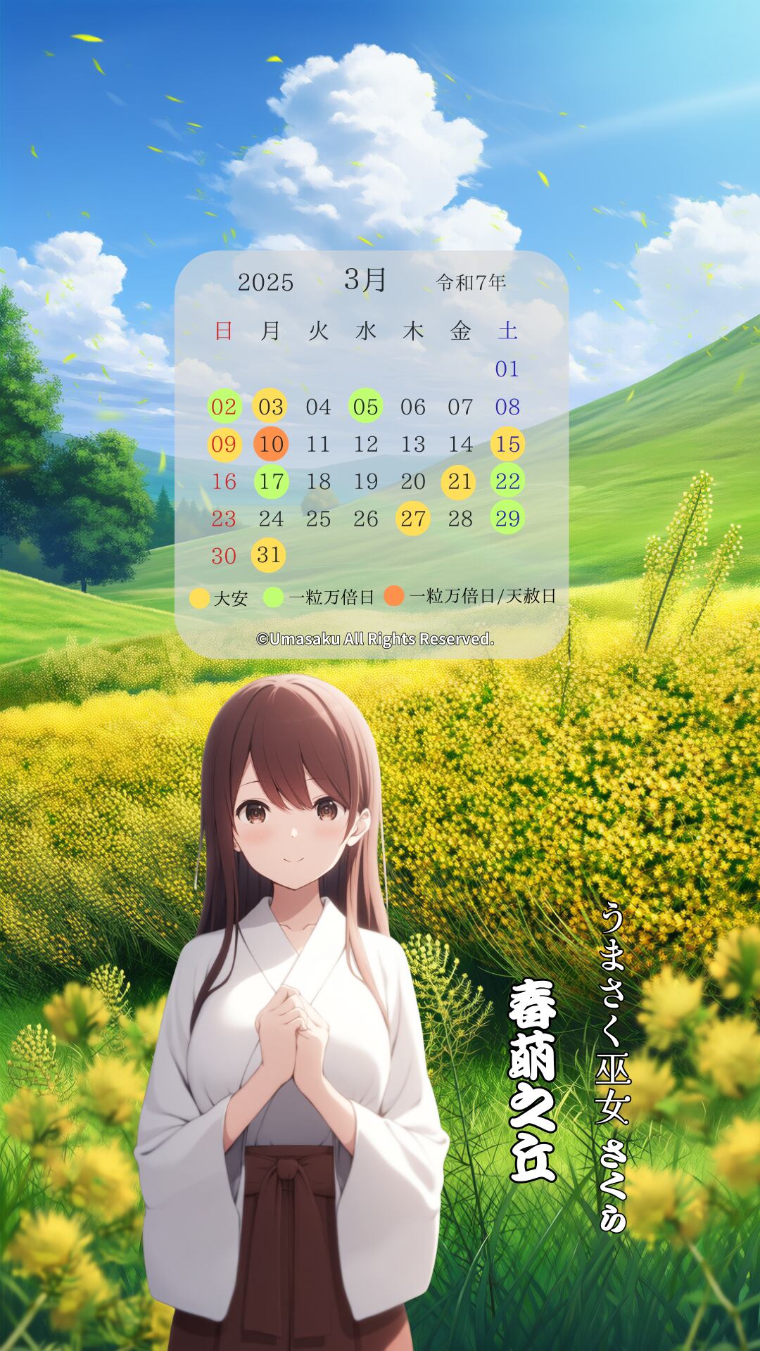 本商品に登場する「巫女さくら」は、当ショップが運営する「うまさく巫女」シリーズ(商標登録出願中)に登場するオリジナルキャラクターです。キャラクターデザイン・名称・世界観は、すべて当ショップで制作・管理しております。