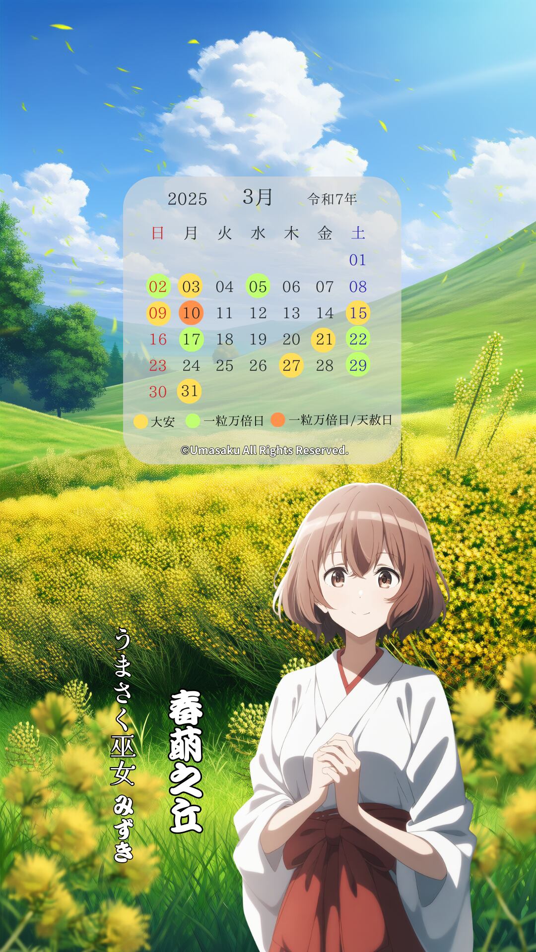 本商品に登場する「巫女みずき」は、当ショップが運営する「うまさく巫女」シリーズ(商標登録出願中)に登場するオリジナルキャラクターです。キャラクターデザイン・名称・世界観は、すべて当ショップで制作・管理しております。