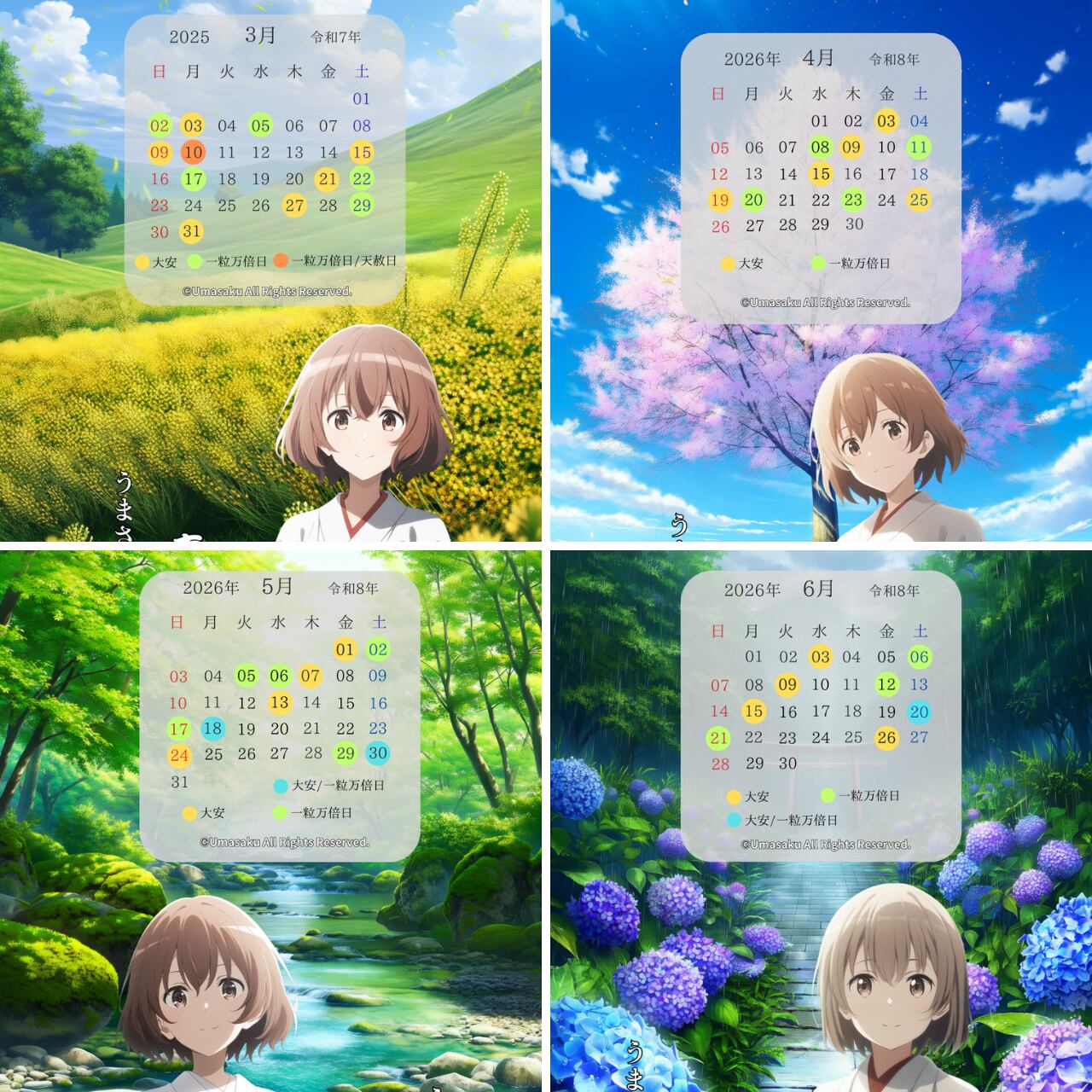 3月〜6月のカレンダー付き巫女壁紙【4枚】と