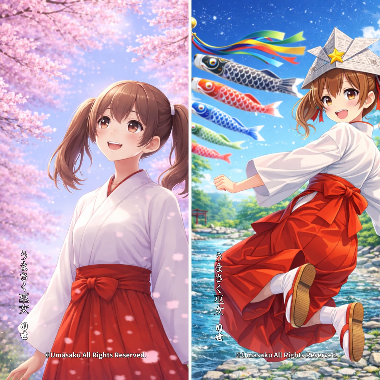 本商品に登場する「巫女みう」は、当ショップが運営する「うまさく巫女」シリーズ(商標登録出願中)に登場するオリジナルキャラクターです。キャラクターデザイン・名称・世界観は、すべて当ショップで制作・管理しております。